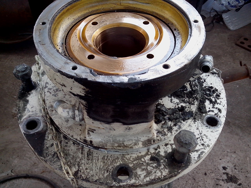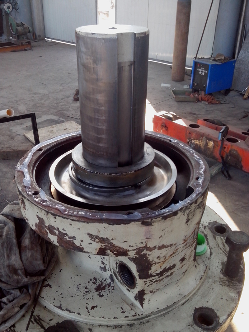 客戶HP500圓錐破碎機的水平軸殼體因過度磨損不能繼續使用,運到我公司維修。由我司技術人員拆解水平軸總成,更換新的水平軸殼體,銅套,護板。